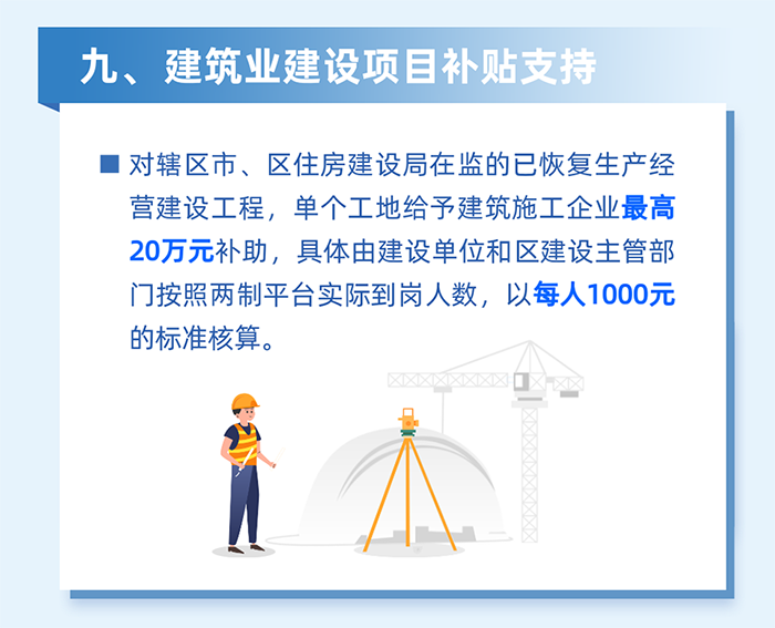 發(fā)放在建項目臨時停工補貼。對轄區(qū)范圍內(nèi)區(qū)住建、區(qū)水務(wù)、區(qū)城管、區(qū)交通以及街道在監(jiān)的已開工建設(shè)工程,在政府依法采取停工等緊急措施期間,按市區(qū)政府部門停工通知前一天錄入“兩制”平臺的勞務(wù)工人數(shù)給予900元/人的補貼給企業(yè),相關(guān)補貼由企業(yè)通過“兩制”平臺發(fā)放至勞務(wù)工人賬戶。(牽頭單位:區(qū)住房和建設(shè)局)