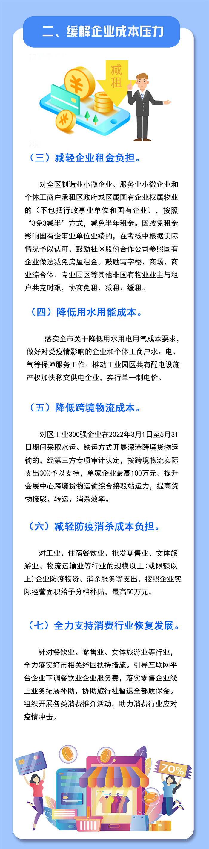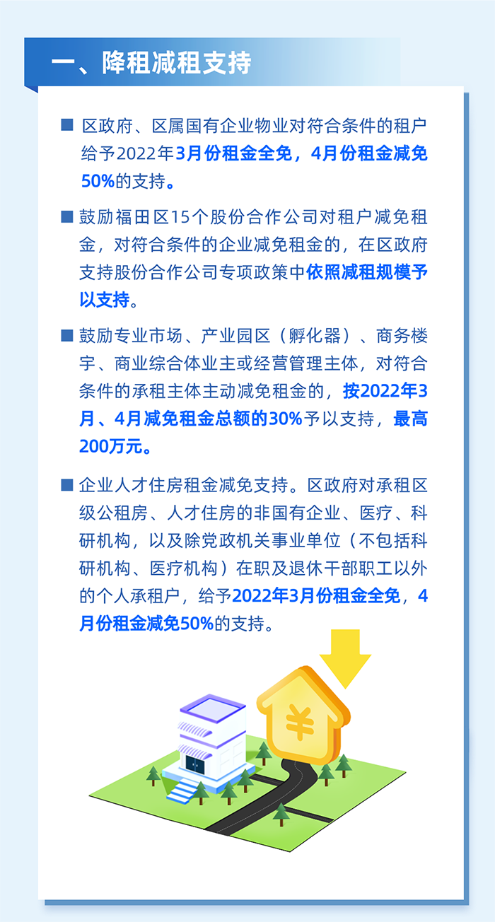 4.鼓勵寫字樓、商場、商業(yè)綜合體、專業(yè)園區(qū)等各類業(yè)主與租戶共克時艱,協(xié)商免租、減租、緩租。對南山區(qū)商業(yè)綜合體、購物中心、大型綜合性商業(yè)零售企業(yè)的經(jīng)營管理主體符合條件的承租企業(yè)減免租金天數(shù)在半個月(含)以上的,按照2022年2月1日至3月31日期間減免租金總額的30%給予經(jīng)營管理主體最高200萬元的資金支持。(責(zé)任單位:區(qū)工業(yè)和信息化局)