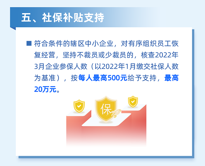 5.對南山區(qū)企業(yè)在深圳居住的員工,居住地自2022年2月1日至3月31日期間,因疫情防控被劃定為封控區(qū)、管控區(qū)(含參照管控區(qū)管理區(qū))而影響正常工作的,根據(jù)企業(yè)實際受影響的員工人數(shù)給予企業(yè)一次性社保補貼。按企業(yè)為受影響員工上月實際繳納社會保險費的30%且每人不超過600元,給予每家企業(yè)最高不超過10萬元的社保補貼。(責(zé)任單位:區(qū)人力資源局)