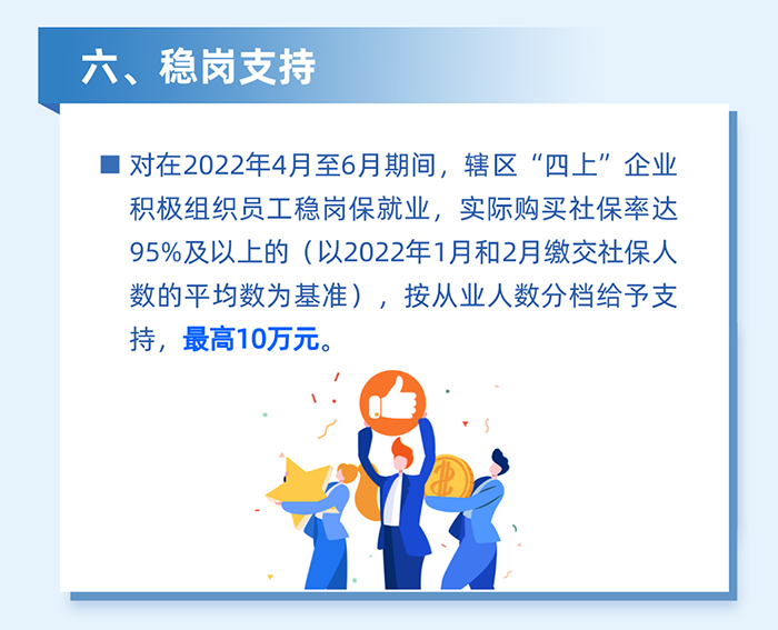 鼓勵企業(yè)穩(wěn)崗留工。對區(qū)四類百強企業(yè)堅持不裁員或少裁員的(2022年3-5月平均繳交失業(yè)保險人數(shù)不低于2022年1月的95%),按2022年3月實際繳納失業(yè)保險人數(shù)給予500元/人的補貼,單家企業(yè)最高20萬元。(牽頭單位:區(qū)人力資源局)