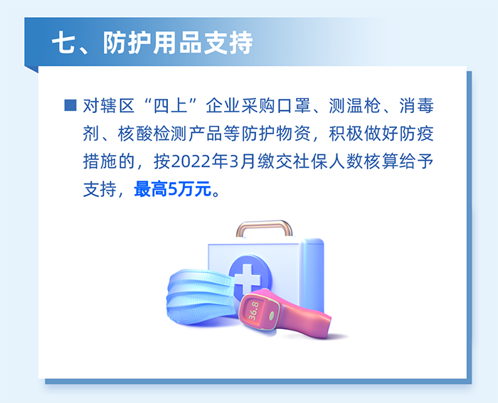 減輕企業(yè)防疫負(fù)擔(dān)。對為員工采購口罩、測溫槍、消毒劑、核酸檢測產(chǎn)品等防疫用品,以及應(yīng)用檢測試劑、防疫醫(yī)療設(shè)備、智能測溫、數(shù)字化信息采集、無人車等數(shù)字防疫設(shè)備的區(qū)四類百強企業(yè),按2022年3月實際繳納失業(yè)保險人數(shù)給予100元/人的補貼,單家企業(yè)最高20萬元。(牽頭單位:區(qū)工業(yè)和信息化局、科技創(chuàng)新局)