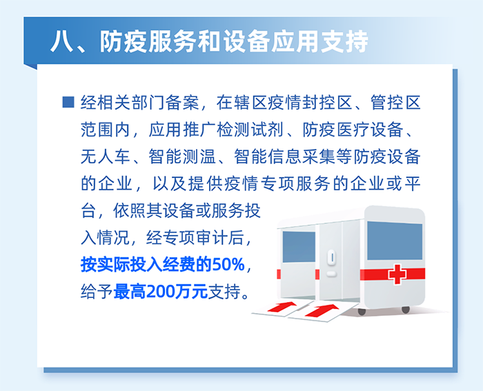 14.支持轄區(qū)科技企業(yè)圍繞疫情產(chǎn)生的新需求自主立項、先行投入,研發(fā)測溫、消殺、運輸、疫情動態(tài)監(jiān)測等人工智能科技抗疫產(chǎn)品,對在2022年2月1日至4月30日期間,將企業(yè)自主研發(fā)的人工智能科技產(chǎn)品無償應(yīng)用于南山區(qū)公共場所進(jìn)行公益性疫情防控工作的,按照不超過其上一年度抗疫相關(guān)產(chǎn)品研發(fā)投入總額的20%且不超過無償應(yīng)用產(chǎn)品的總價值給予資助,每家企業(yè)資助最高不超過20萬元。(責(zé)任單位:區(qū)科技創(chuàng)新局)