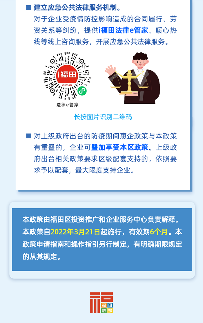 開展專項法律援助。建立應(yīng)急公共法律服務(wù)機(jī)制,對于企業(yè)受疫情防控影響造成的合同履行、勞資關(guān)系等糾紛,設(shè)立專線提供應(yīng)急公共法律咨詢服務(wù)。(牽頭單位:區(qū)司法局)